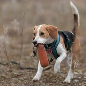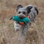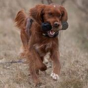 Der Hund sieht einen fliegenden Dummy und merkt sich die Fallstelle.